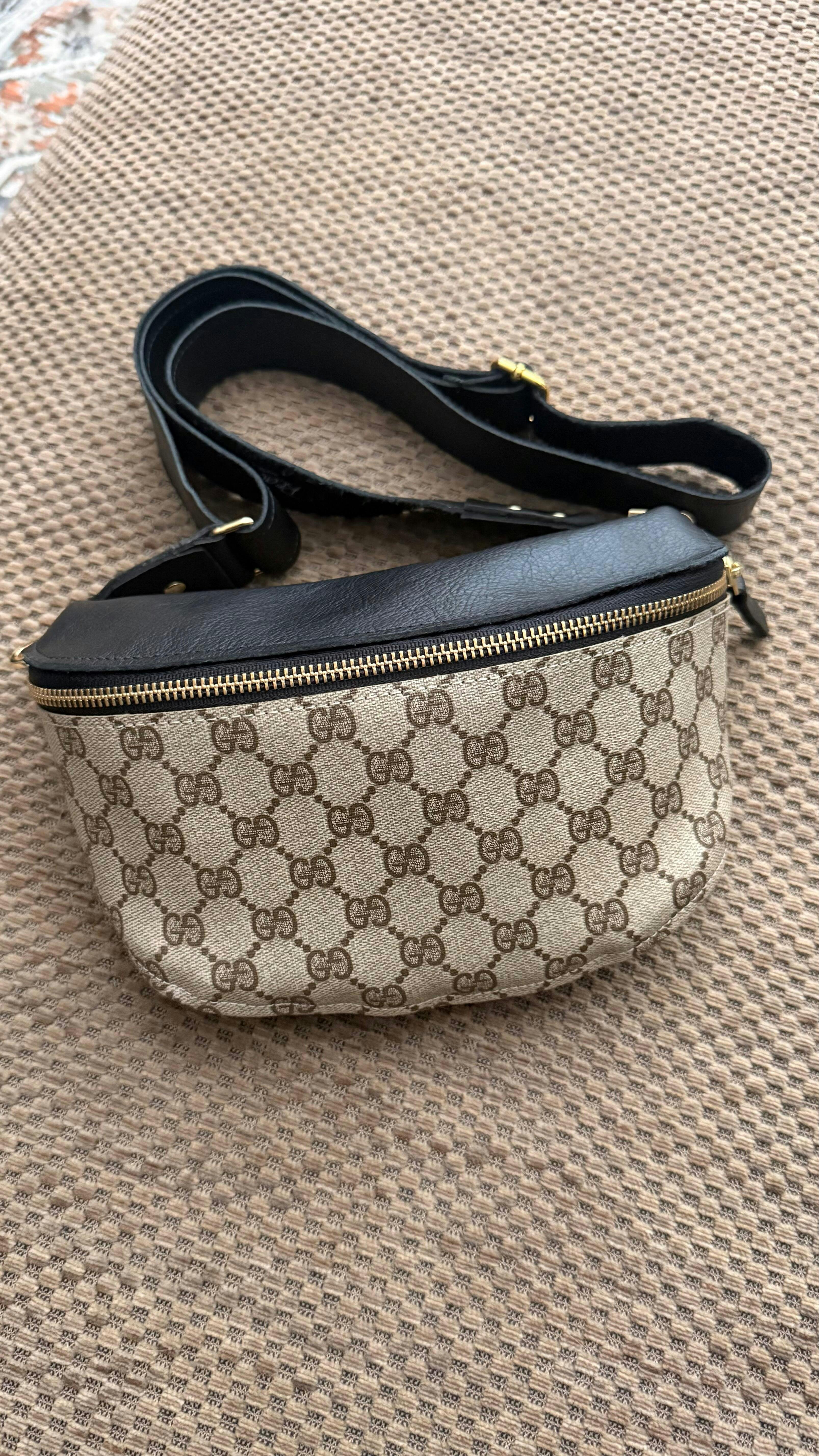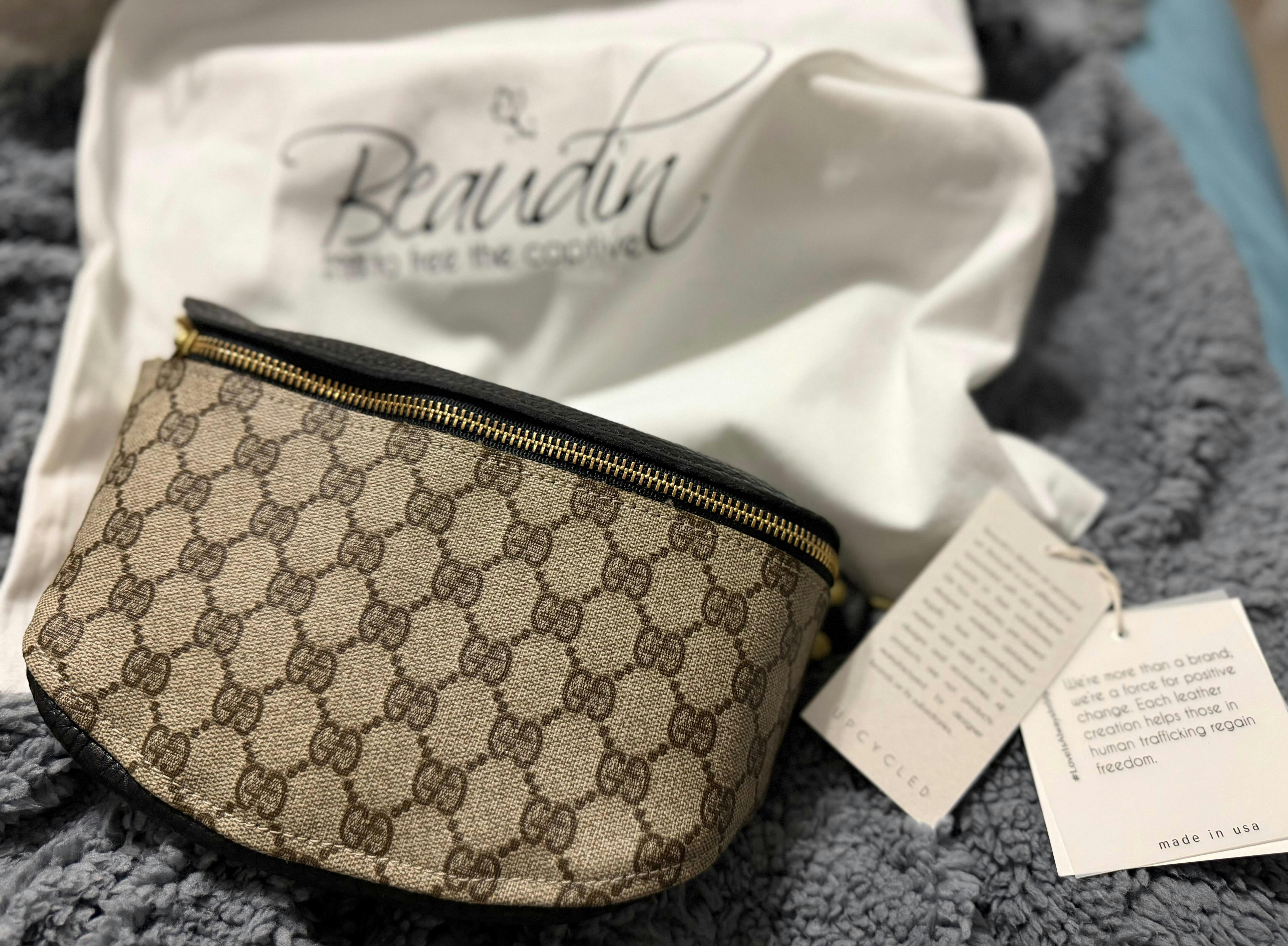 Britt Designer Belt Bag Women's, is a versatile and stylish accessory. Crafted from premium leather and vintage Gucci canvas, this leather belt bag offers a unique blend of luxury and sustainability with upcycled designer Gucci canvas.