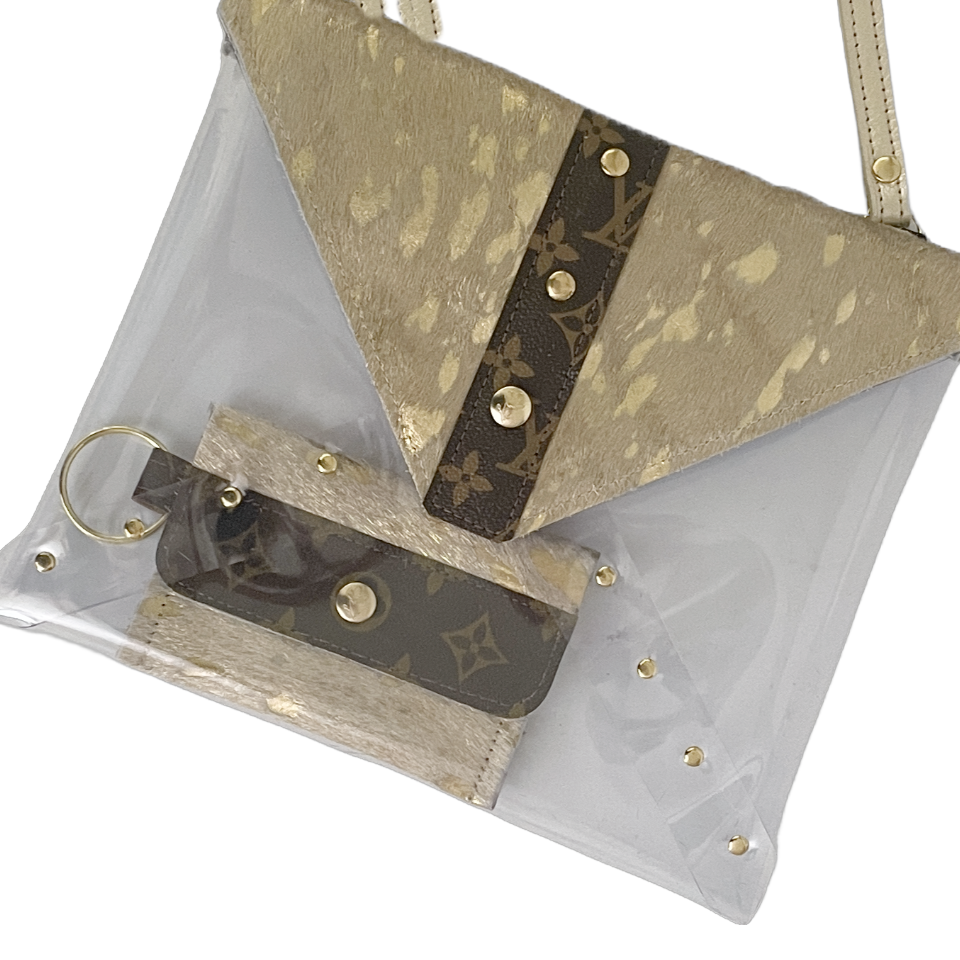 Upcycled Louis Vuitton canvas adorns our Game Time bag! Made with thick clear vinyl and 100% genuine leather, this classic and modern envelope style can easily be worn as both a crossbody or shoulder bag. Also spacious enough to carry a wallet, keys, phone, and more! Most importantly, the Game Time bag meets stadium regulations. With the Game Time bag, you’ll always go to the game in style!