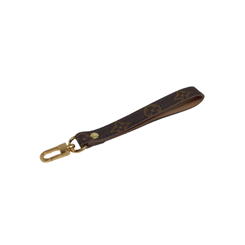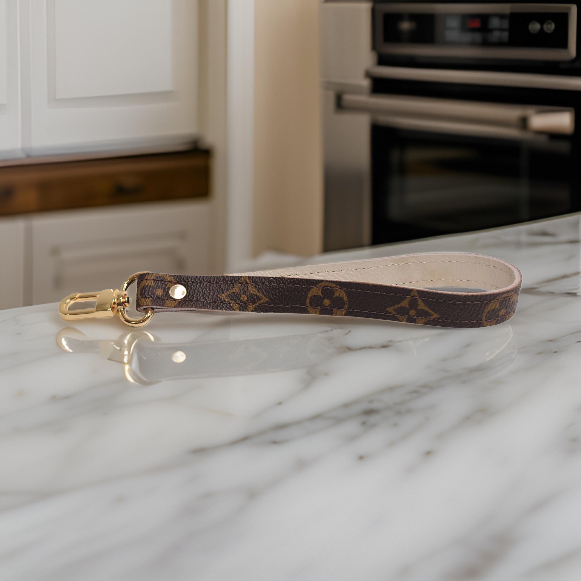 Upcycled Louis Vuitton Wristlet Strap - Elevate your look with our sleek and durable replacement wrist strap. Perfect for active lifestyles, these straps are crafted with high-quality upcycled Louis Vuitton canvas to ensure long-lasting wear. Leather backing makes them luxurious and soft on the wrist. Use as a replacement strap for your wristlet, or as a key fob.